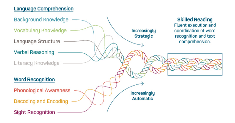 Our curriculum focuses on all of the foundational literacy skills identified in the lower strands of Scarborough’s Rope Model: