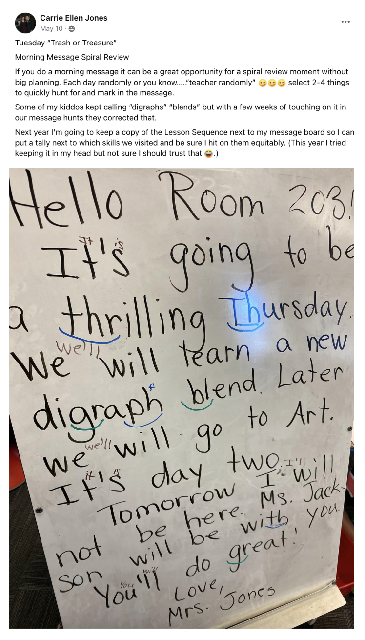 - The morning message is a great way to spiral reviewed skills in context. Take a couple of minutes for students to scan the message for previously taught skills and discuss. Carrie Jones, a first-grade teacher, says her students love reviewing previous skills; for some, it provides the needed practice to master them.