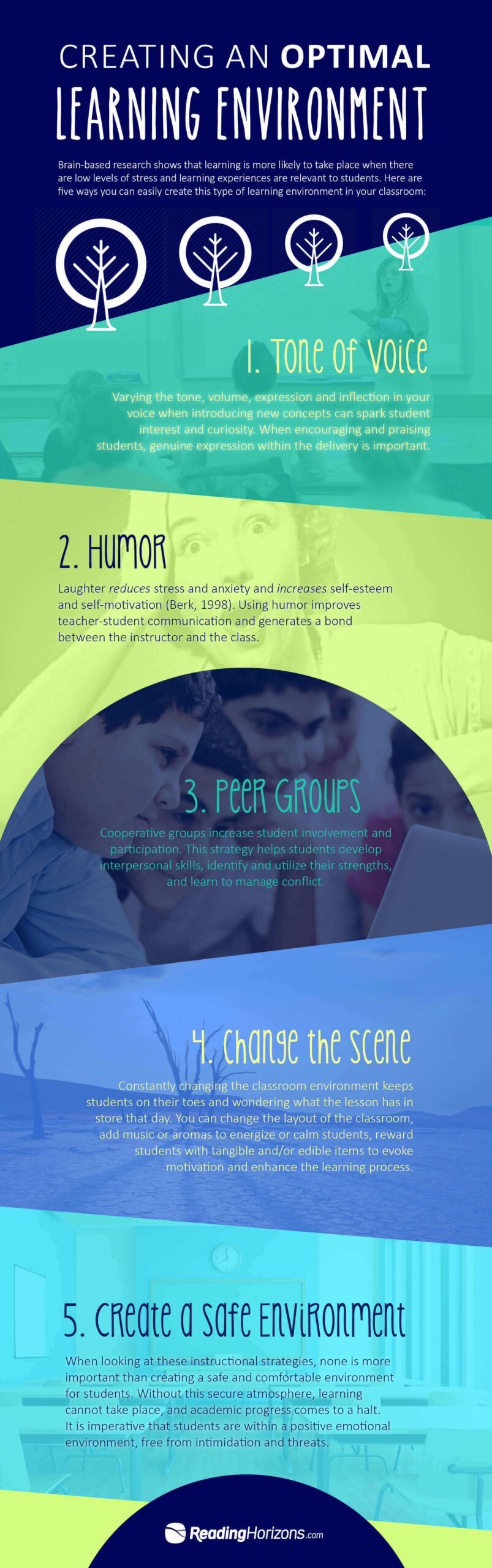 When looking at these instructional strategies, none is more important than creating a safe and comfortable environment for students. Without this secure atmosphere, learning cannot take place, and academic progress comes to a halt. It is imperative that students are within a positive emotional environment, free from intimidation and threats. Building a classroom environment where students are respected and feel comfortable expressing their ideas and perspectives provides a setting for optimal learning.