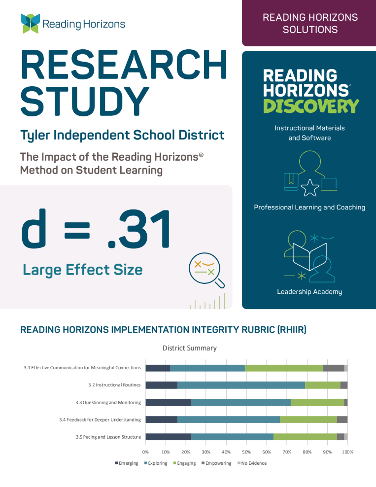 This rigorous study compared impacts between students whose teachers implemented Reading Horizons Discovery® and those whose teachers did not during the 2021–2022 school year. With exposure to the Reading Horizons method, average student growth was more than double that of students without exposure.